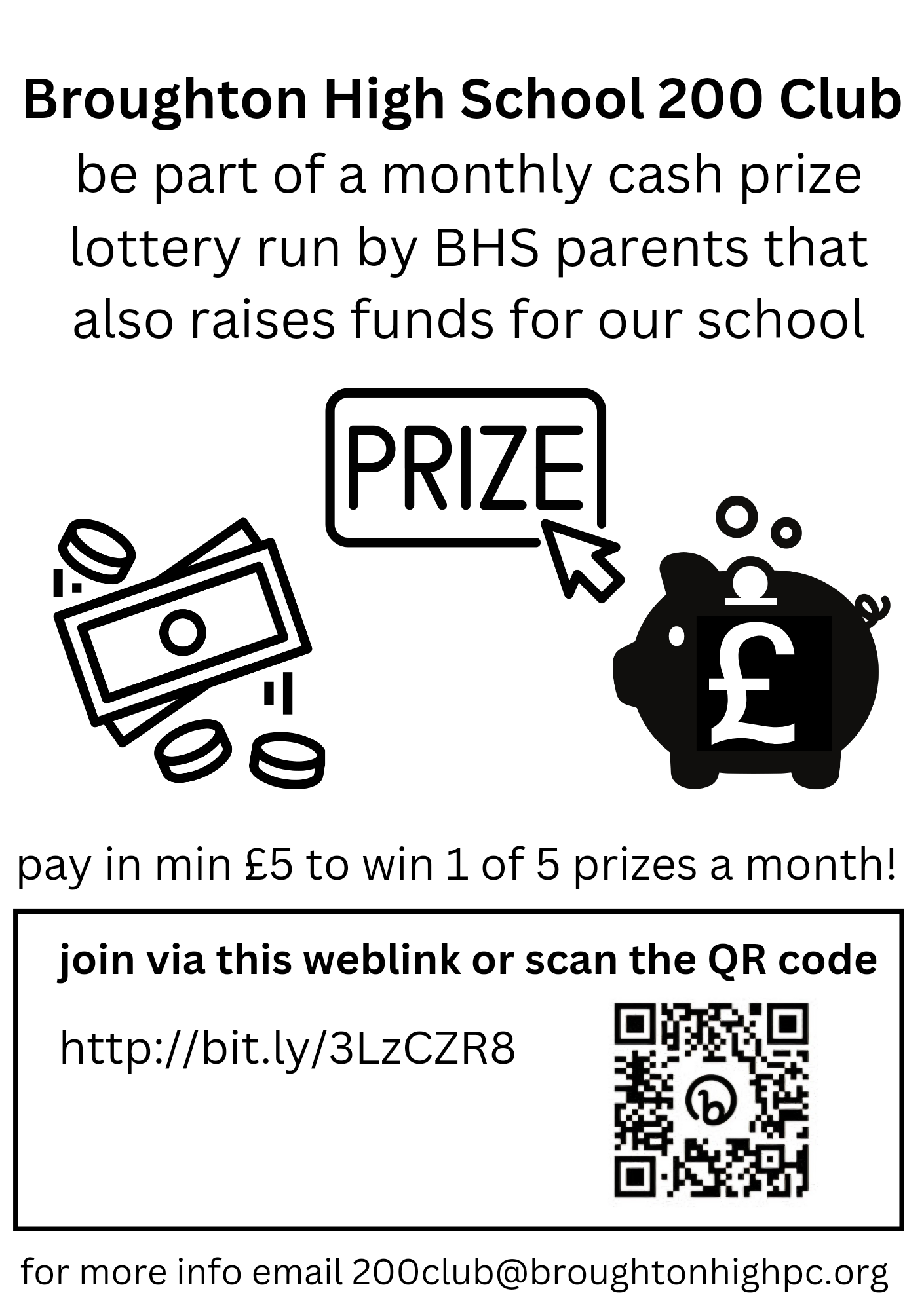 The 200 Club is a monthly cash lottery with cash prizes of up to £35 that any Broughton High family or friends can join. Make sure you register to support Broughton High School Association and we benefit from your contributions at the end of the year.